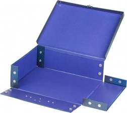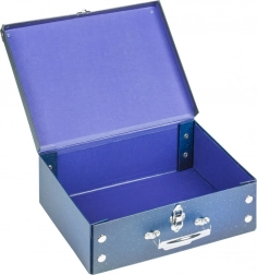 • Skladací kufrík z pevného laminovaného papiera s okovanými rohmi.