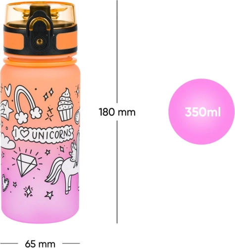 Štýlová tritanová fľaša na pitie s objemom 350 ml s motívom jednorožca a farebným prechodom je ideálna do školy, na výlety aj šport. Ponúka bezpečné uzamykateľné viečko, praktické pútko na nosenie a vnútorné sitko na ovocie či bylinky. Je vyrobená z certifikovaného tritanu bez BPA, bez zápachu a vhodná aj na horúce nápoje.