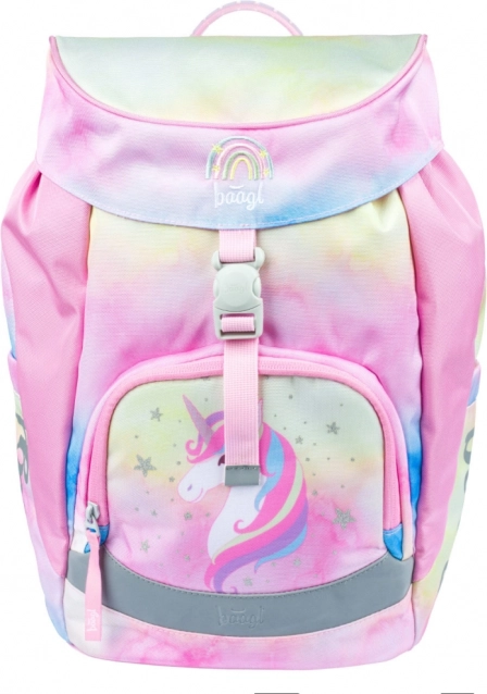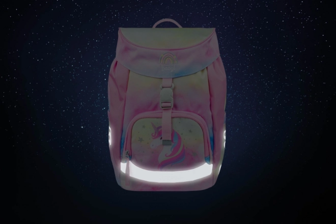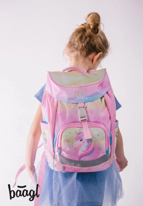 Veselý školský set pre malých školákov s motívom duhového jednorožca – ultraľahký batoh BAAGL Airy, dvojchlopňový peračník a praktické vrecko na prezuvky. Batoh ponúka iba 750 g, ergonomický chrbát s AIRFLOW ERGO systémom, magnetické zapínanie a reflexné prvky pre bezpečnosť. Ideálne pre deti s výškou 110–135 cm.
