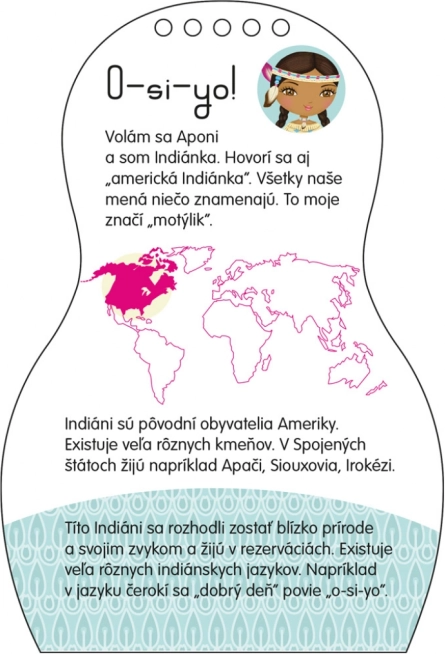 Kreatívna sada pre malých návrhárov a objaviteľov. Deti môžu vytvárať vlastné modely podľa motívov rôznych kultúr, skladať outfit po outfite a pritom sa dozvedať zaujímavosti o tom, ako ich rovesníci žijú, učia sa, zabávajú a aké špeciality ochutnávajú. Omaľovánky s motívom Aponi prinášajú hravú formu spoznávania sveta.