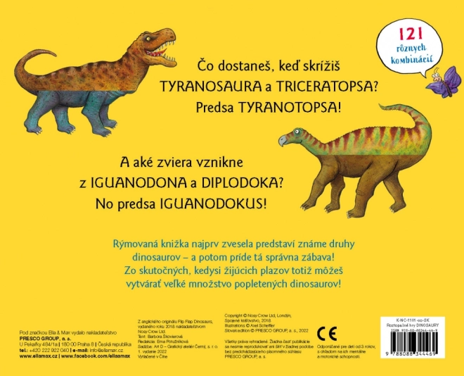 Táto slovenská verzia obľúbeného leporela hravou formou zoznamuje malých čitateľov s dinosaurami – niekdajšími pánmi vzduchu, vôd aj súše. Rýmované texty a nápaditý koncept skladania častí stránok premenia každé listovanie na originálne dobrodružstvo, pri ktorom vznikajú rozmanité a vtipné kombinácie dinosaurov.