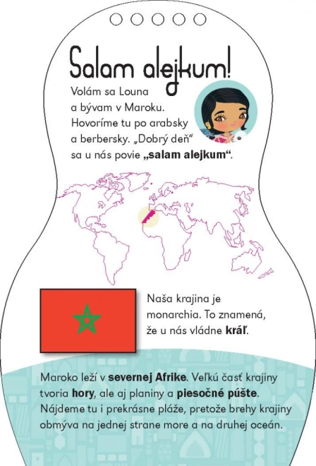 Vydajte sa s deťmi na výpravu za poznaním do exotického Maroka. Kreatívny zošit LOUNA ponúka jedinečné spojenie zábavy a vzdelávania – deti si užijú vyfarbovanie, nalepovanie a zároveň sa dozvedia, ako sa ich rovesníci v Maroku zdravia, čo jedia alebo aké tradičné odevy nosia.