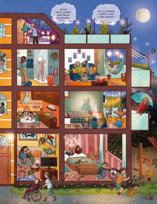 Objavujte s deťmi, čo sa deje, keď svet okolo zaspáva. Stránky plné detailných ilustrácií otvárajú dvere na farmu, do rušného mesta aj hlbokého lesa – a nechýba ani svet hračiek, ktoré v noci ožívajú. Kniha pozýva k opakovanému prezeraniu a spoločnému rozprávaniu.