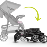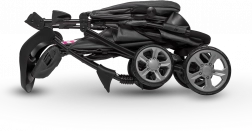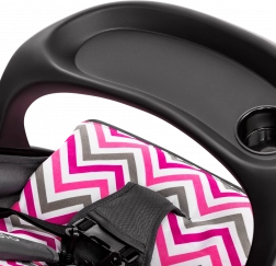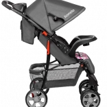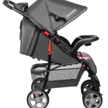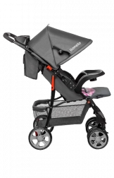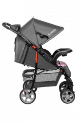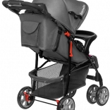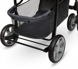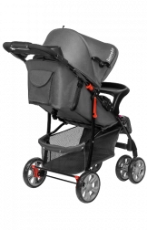Päťbodové pásy s mäkkými chráničmi a predná bariérka s táckou zvyšujú bezpečie a pohodlie. Konštrukcia spĺňa normu EN 1888, overené v laboratóriu SGS.