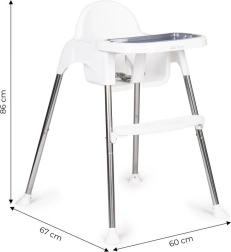 Moderná jedálenská stolička 2v1 je vyrobená z kvalitného materiálu. Stolička je vhodná pre deti od 6 mesiacov do 36 mesiacov. Môže byť zložená v dvoch výškach. Výhody stoličky: pohodlné sedadlo so zábranou proti zosunutiu, 5-bodové bezpečnostné pásy, stabilné protišmykové nožičky, praktická opierka na nohy, odnímateľný plastový pult. Rozmery zloženej stoličky sú cca 86 x 67 x 60 cm. Maximálna nosnosť je 15 kg.