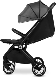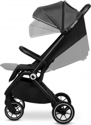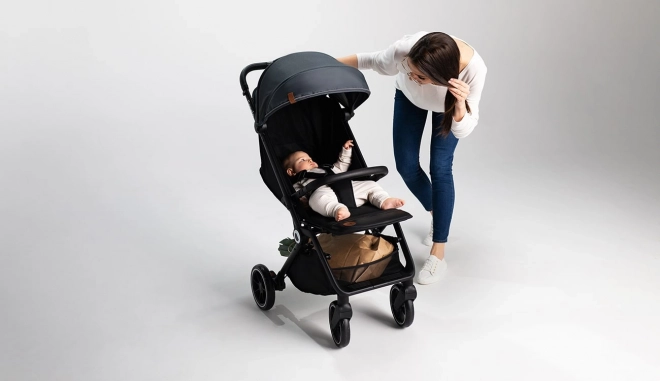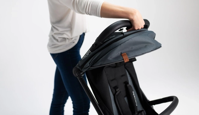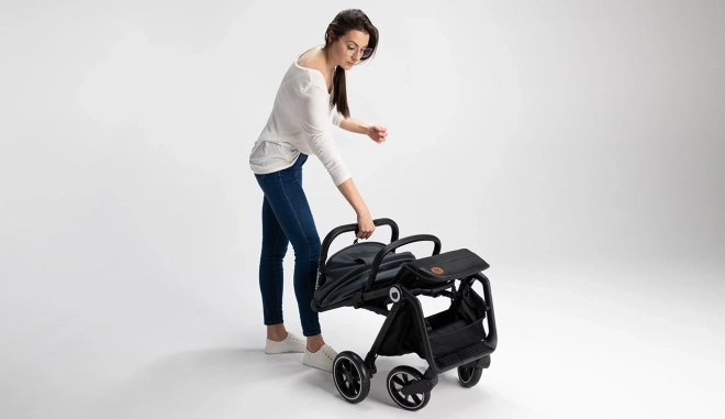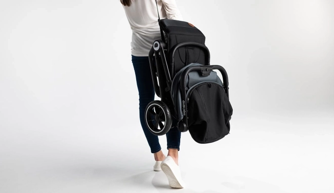 Stlačením jedného tlačidla kočík zložíte do kompaktného tvaru a vďaka popruhu ho ľahko prenesiete na pleci – ideálny do mesta aj na cesty.