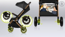 Pre maximálny komfort dieťaťa nechýba nastaviteľné operadlo až do ľahu, nastaviteľná opierka nôh z ekokože a XXL nepremokavá strieška s filtrom UPF50+ a okienkom. Rodičia ocenia automatické skladanie na tlačidlo, praktický popruh na prenášanie, priestranný kôš (nosnosť 3 kg) aj click&ride systém pre pohodlný krok a istú nožnú brzdu.