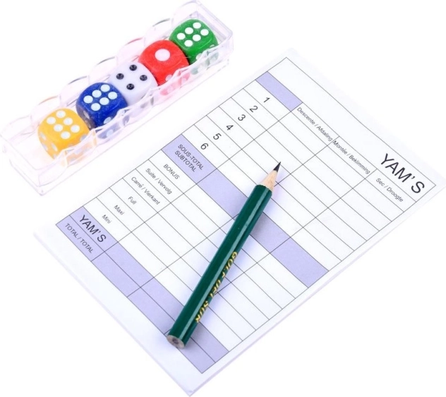 Balenie obsahuje 5 kusov farebných kociek so zápisníkom na zapisovanie bodov a ceruzku. Veľkosť kocky: 1,5 × 1,5 × 1,5 cm. Obľúbená hra pre deti aj dospelých. Cieľom klasickej hry v kocky je dosiahnuť čo najvyšší počet bodov. Sada obsahuje: