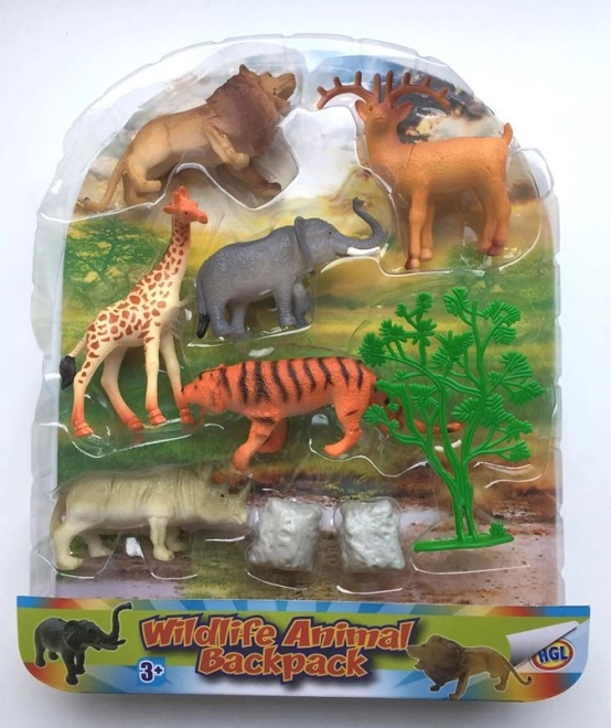 Zábavná sada 6 figúrok divokých zvierat v praktickom batôžku: lev, tiger, jeleň, nosorožec, slon a žirafa s doplnkami. Priehľadný batôžok s nastaviteľnými popruhmi uľahčí prenášanie aj ukladanie; figúrky merajú cca 8 × 5 × 3 cm.