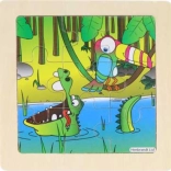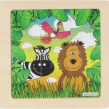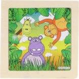 Táto kvalitná drevená skladačka s motívom džungle je ideálne prvé puzzle pre malé deti. Vďaka vyfrézovanému okraju v podložke dieliky lepšie zapadnú a dieťa sa môže sústrediť na radosť zo skladania. Ilustrácie s veselými opičkami podporujú vnímanie farieb a tvarov.