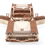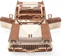 Model poteší aj množstvom voľne uložených detailov – za zadnými blatníkmi nájdete kufrík s náradím a zdvihák, funkčné stierače, výsuvné okienka dverí a sklopné zadné sedadlá. Odpružené závesy kolies sa postarajú o realistickú jazdu. Stavebnica je vyrobená z kvalitnej preglejky a doplnená podrobným návodom.