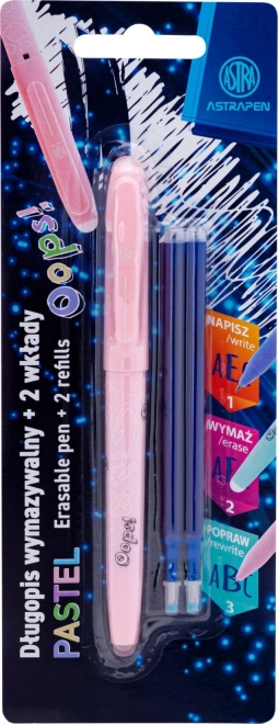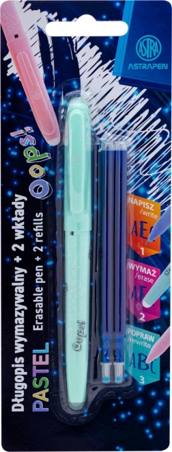 Praktické gumovacie pero Astra Oops s jemnou šírkou stopy 0,6 mm umožňuje plynulé písanie a rýchle opravy vďaka špeciálnemu atramentu, ktorý možno zmazať z oboch koncov pera. Ponúka ergonomický úchop, protišmykové telo a vymeniteľnú modrú náplň. Ideálne do školy, kancelárie aj domácnosti.