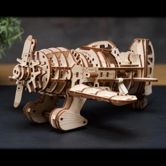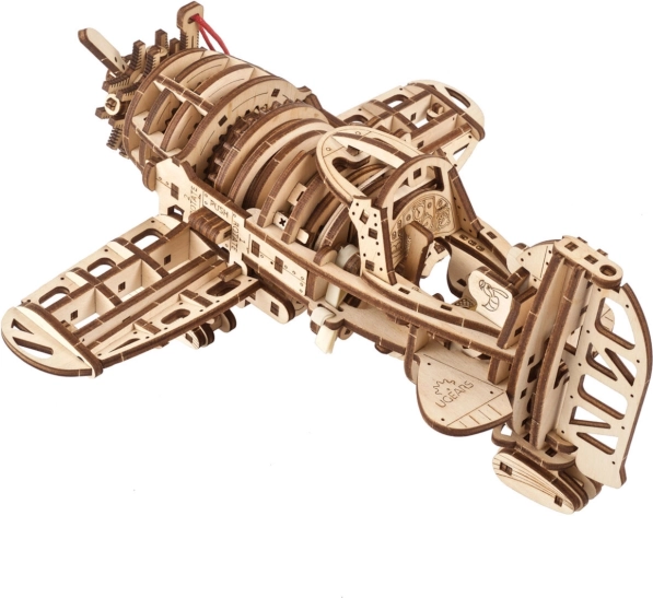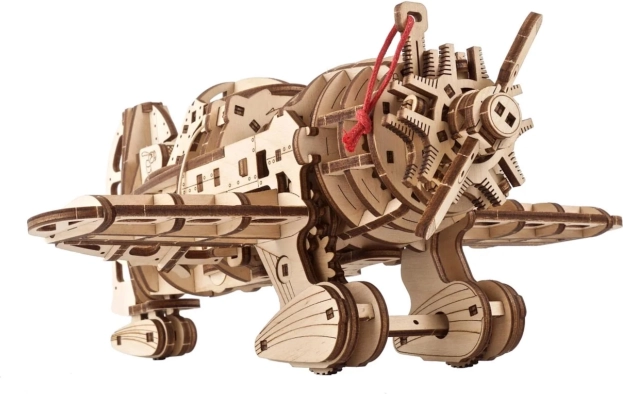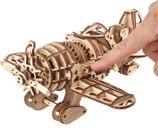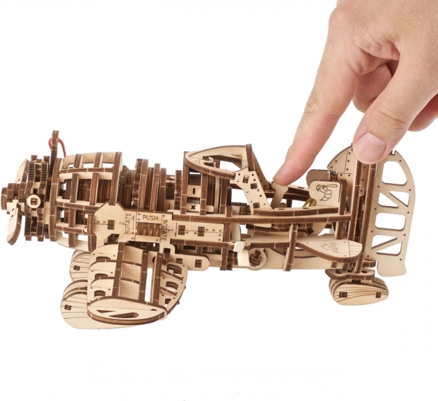 Model ponúka dva režimy správania – predletovú kontrolu s pohybmi klapiek a kormidla a potom možnosť pohybu, kedy na jedno natiahnutie prejde až 2,5 metra. Nastaviteľné zadné koliesko umožňuje riadiť smer jazdy. Vnútri sa deťom aj dospelým otvorí svet fascinujúceho pohybu piestov hviezdicového motora.