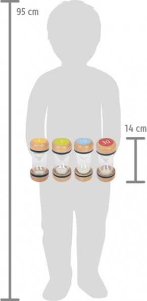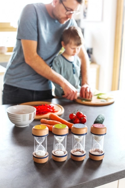 Sada presýpacích hodín XL kombinuje prírodné bukové drevo a číre sklo/plast pre jasnú viditeľnosť sypúceho sa piesku. Každé hodiny sú farebne a číselne označené pre rýchlu orientáciu a presné meranie krátkych časových úsekov. Hodí sa na domáce úlohy, tréning sústredenia, stolové hry aj kuchynské načasovanie.