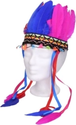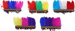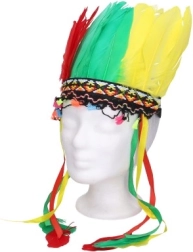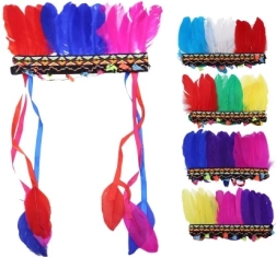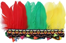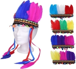 Čelenka je zdobená farebnými pierkami a ozdobnými stuhami, čo z nej robí ideálny doplnok pre kostýmy.