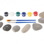 Súčasťou setu sú starostlivo vybrané, hladké okruhliaky, pestrá paleta akrylových farieb a dva rôzne veľké štetce na detaily aj vyplňovanie plôch. Táto výtvarná činnosť rozvíja kreativitu, trpezlivosť a sústredenie a prináša radosť z hotového výtvoru.