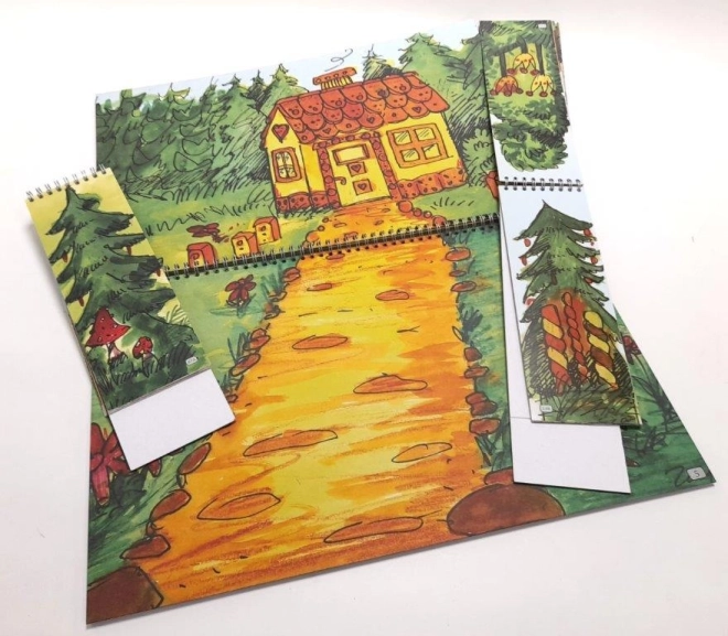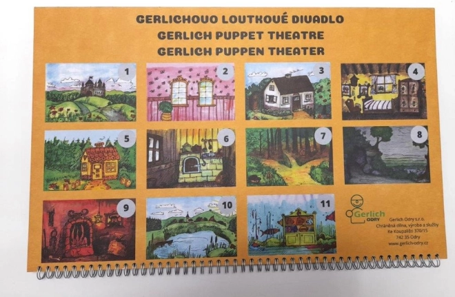 Súčasťou je 11 obojstranných či párových scén na krúžkovej väzbe s podlahou: na zámku / pred zámkom, pred chalupou / v chalupe, perníková chalúpka / v perníkovej chalúpke, v lese / pri jaskyni, v pekle / pri rybníku, v rybníku. Bábky zahŕňajú kráľovskú rodinu, hrdinov aj rozprávkové bytosti – ideálne pre klasické české rozprávky.