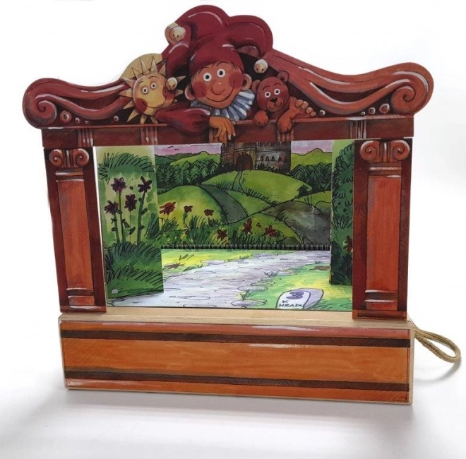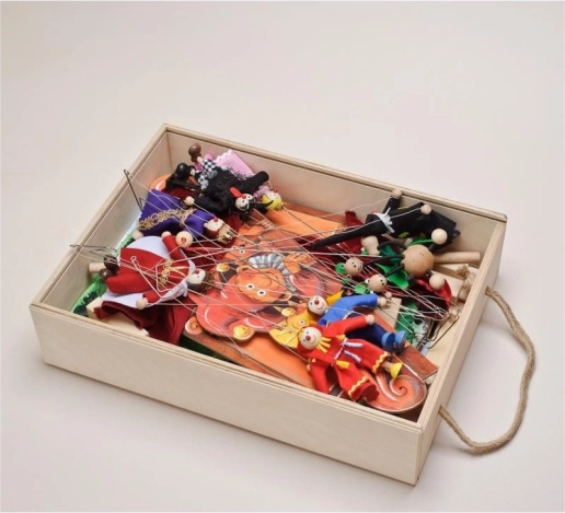 V balení nájdete 14 drevených bábok, 11 farebných scén, prosénium, oponu a bočné kulisy – všetko prehľadne uložené v drevenej krabici s uškom.