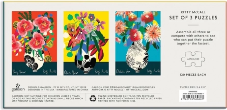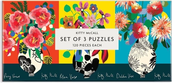 Súprava puzzle Kitty McCall obsahuje tri 120-dielne puzzle s výraznými farebnými ilustráciami kvetinových aranžmánov vo vázach od umelkyne Kitty McCall, pôvodom z Nigérie, britskej umelkyne. Kitty McCall, ovplyvnená prírodným svetom okolo seba a pulzujúcou krajinou svojho raného detstva v Nigérii, si vyvinula charakteristický štýl výrazných farieb, prekrývajúcich sa vzorov a tvarov, aby vytvárala geometrické vzory a kvetinové krajiny pre interiéry a doplnky. Vonkajšia škatuľka má magnetické zatváranie. Puzzle sú balené v pevnej krabici, vhodnej na opakované použitie a skladovanie. Ideálne ako darček. Autorom obrázka je Kitty McCall. Puzzle sú vyrobené s použitím významného podielu recyklovaného papiera a ponúkajú špičkovú tlač nezávadnými farbami. Sú opatrené matnou povrchovou úpravou, ktorá zabezpečuje za všetkých okolností verné podanie detailov aj farieb. Ich zadná strana je potiahnutá hladkým, na dotyk príjemným povrchom, vďaka ktorému sa pri skladovaní rozloženého puzzle nepráši. Spolu so starostlivo zabalenými dielikmi nájdete v balení aj letáčik s návodným obrázkom, ktorý spravidla obsahuje ďalšie informácie o tvorcoch a pozadí vzniku diela. Dodávané vo mimoriadne pevnej a pútavo spracovanej kartónovej krabičke vyrobenej z recyklovaného kartónu. Hlavné vlastnosti: 120 precízne vyrezaných dielikov vyrobené s použitím recyklovaných a udržateľne získaných materiálov starostlivo vybraný motív od renomovaných tvorcov a umelcov potlač a prevedenie najvyššej kvality obsahuje návodný obrázok