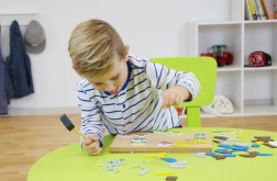 Pestujte zručnosti jemnej motoriky a presnosti dieťaťa pri používaní kladivka na upevňovanie tvarov na korkovú dosku.