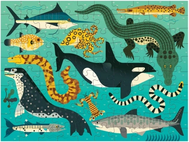 Toto pútavé puzzle zobrazuje na jednej strane pozemných predátorov, zatiaľ čo na druhej strane morské lovce hlbín. Vyrobené z významného podielu recyklovaného papiera, zaisťuje ekologickú udržateľnosť a nezávadnosť použitých farieb. Povrchová úprava je matná, čo garantuje verné podanie detailov i farieb, a hladký povrch zadnej strany bráni tvorbe prachu pri skladovaní.