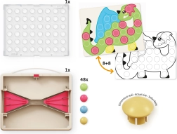 Fantacolor Junior Play Eco+ je šikovná vzdelávacia mozaika, ktorá vedie deti k tvorivosti a trpezlivosti. Vďaka priehľadnej perforovanej doske deti ľahko vkladajú veľké, okrúhle kolíky do otvorov a podľa ilustrovaných kariet skladajú roztomilé motívy zvieratiek a predmetov.