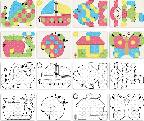 Súčasťou je 8 ilustrovaných kariet s jednoduchými a zábavnými motívmi, ktoré rozvíjajú kreativitu a vizuálne vnímanie.