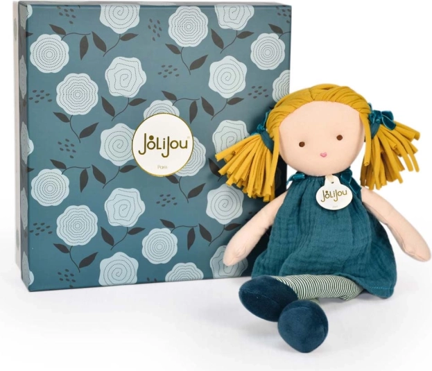Bábika Jade od Doudou Jolijou je nežná spoločníčka pre bábätká aj predškolákov. Jej boho vzhľad podčiarkujú pruhované pančušky, tyrkysové šatočky a „špagetové“ blond vlásky stiahnuté do vrkôčikov. Vďaka mäkkému textilnému prevedeniu sa skvele mojká a je maximálne bezpečná.