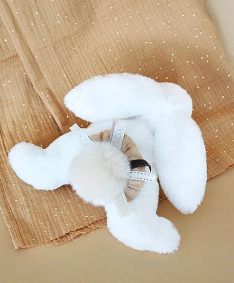 Roztomilý plyšový zajačik v darčekovej sade je mimoriadne mäkký a univerzálny – poslúži ako kamarát, vankúšik aj štýlová dekorácia detskej izby. Vďaka prémiovým materiálom, jemnému plyšu a upokojujúcim farbám je ideálny pre bábätká od narodenia. Elegantná béžová bambuľka a šatka dodávajú hračke moderný vzhľad, darčeková krabička z nej robí perfektný darček.