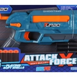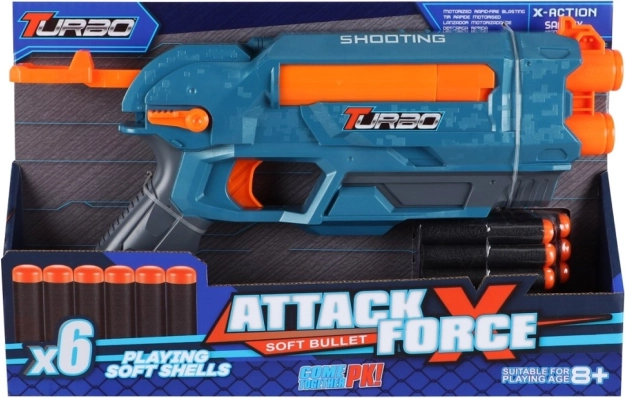 - Balenie, ktoré zahŕňa blaster a 6 kusov nábojov z mäkkého penového materiálu.