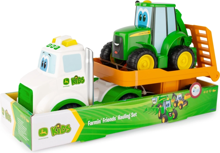 Táto herná sada kombinuje tahač s nájazdom a priateľský traktor Johnny v klasických farbách JOHN DEERE. Deti si precvičia jemnú motoriku pri nakladaní a vykladaní a zároveň rozvíjajú predstavivosť pri hraní na farmu. Vďaka dĺžke 37 cm je set dobre uchopiteľný a stabilný.