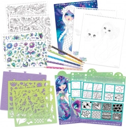 Súčasťou setu je bohaté príslušenstvo pre nápaditú tvorbu: samolepky, šablóny, textúry aj kvalitné obojstranné pastelky. Priložené ukážky techník a základná teória farieb pomôžu zlepšiť kresliarske zručnosti a podporia sebavyjadrenie.