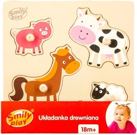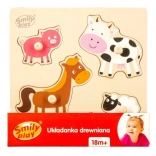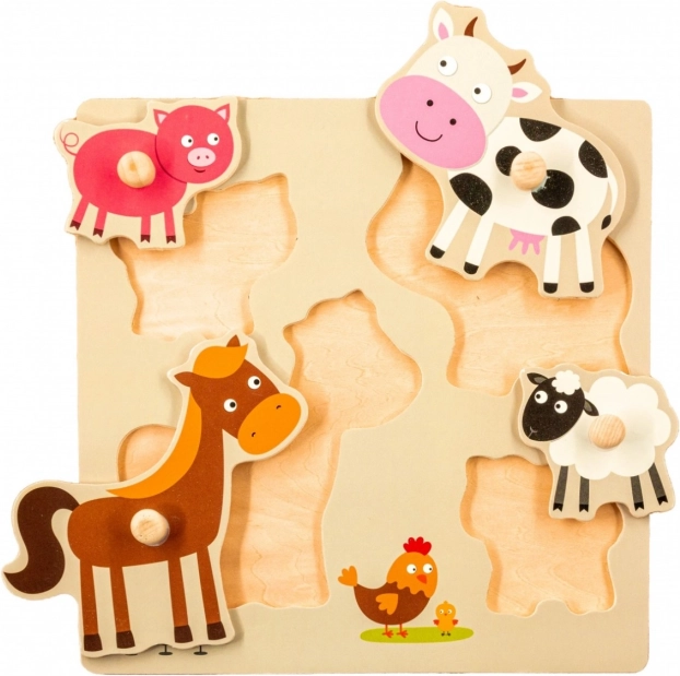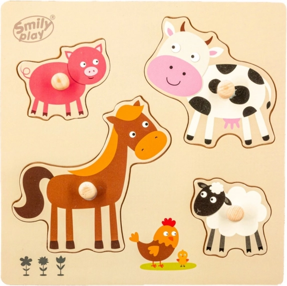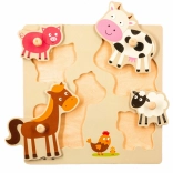 Drevené puzzle so špeciálne tvarovanými miestami na doske ponúka štyri rôzne tvary a farby, predstavujúce domáce zvieratá. Každý dielik má úchyt, ktorý uľahčuje skladanie dieťaťu.