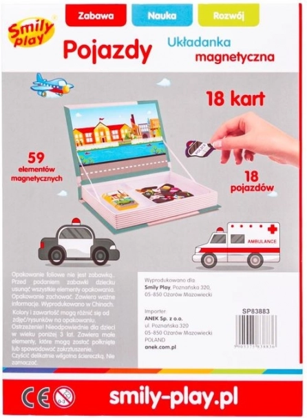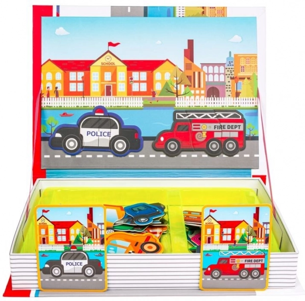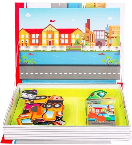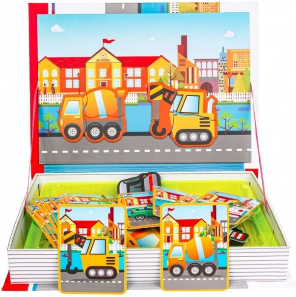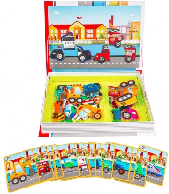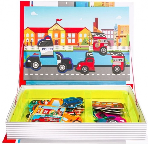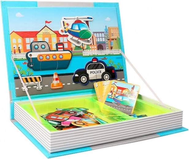 Magnetická skladačka s motívom dopravných prostriedkov je uložená v uzatvárateľnej krabičke v tvare knihy, ktorá po otvorení slúži ako podložka na skladanie. Z priložených dielikov deti vytvárajú rôzne vozidlá, stroje a prostriedky hromadnej dopravy podľa kariet s predlohami alebo podľa vlastnej fantázie.