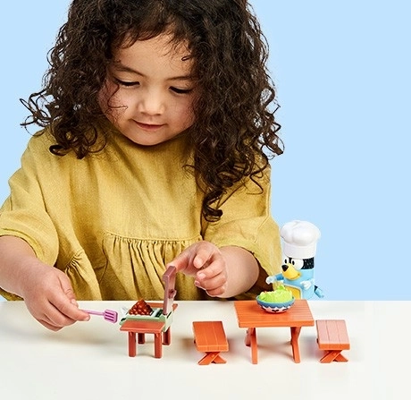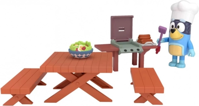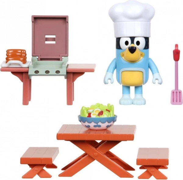 Kompletný mini set s figúrkou Bluey v kuchárskej čiapke, grilom a piknikovým stolom. Ideálne na prehrávanie obľúbených momentov z BLUEY.