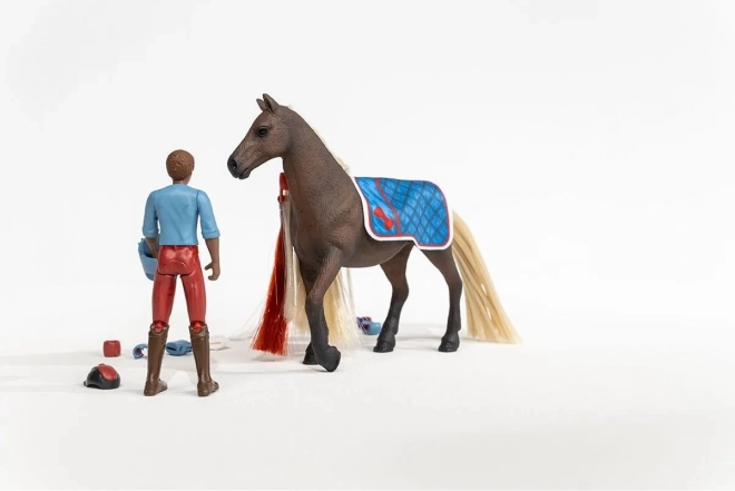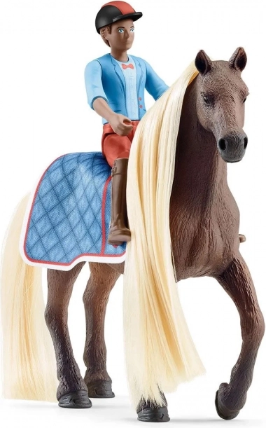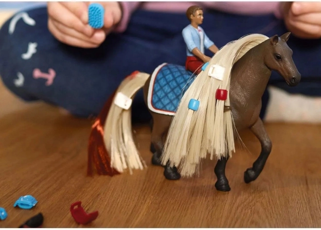Figúrka jazdca s pohyblivými končatinami, sedlo s mäkkou dečkou a uzdička umožňujú prirodzené usadenie do sedla a autentické jazdecké scény.