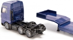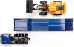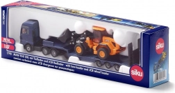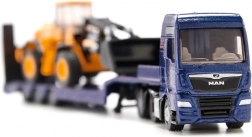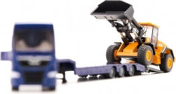Táto detailná sada kombinuje modrý ťahač MAN TGX s nízkoložným návesom a stavebný nakladač JCB. Odolná kovová konštrukcia (die-cast) s presnými potlačami a voľne sa otáčajúcimi kolesami ponúka autentický vzhľad aj funkčnosť. Vďaka pohyblivej lyžici nakladača a nájazdom prívesu deti ľahko zinscenujú prepravu stavebných strojov.
