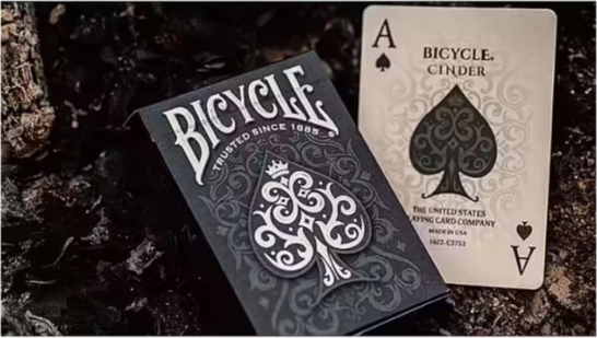Táto štýlová edícia kariet Bicycle Cinder prináša prémiový vzhľad aj pocit v ruke. Tlmené popolavé odtiene sivej kontrastujú s leskom striebornej fólie, zatiaľ čo dvojúrovňové razenie vytvára pôsobivý 3D efekt. Teplé zlaté tónovanie figúr symbolizuje rozžeravené uhlíky, z ktorých sa vznáša dym – motív, ktorý setu dodáva jedinečnú atmosféru.