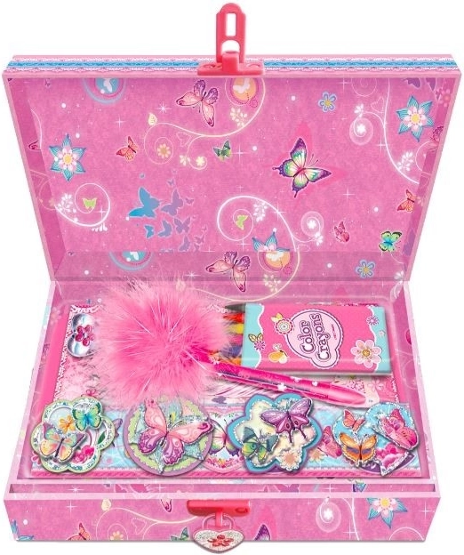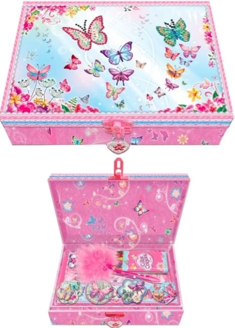 Sada s denníkom Pecoware s motívom motýľov je balená v ozdobnej krabičke a uzatvára sa na malý zámok, čo je ideálne pre uchovanie vašich tajomstiev v bezpečí.