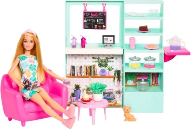 Hrajte sa na kaviareň s Barbie, ktorá má v balení štýlové šaty s dekoratívnym motívom listov. Spoločnosť vám bude robiť aj malá figúrka mačky, ktorá dodáva celej scéne kúzlo. Zmena farby alebo chutí v hernom prostredí je jednoduchá vďaka kúzelným čajovým kanviciam.