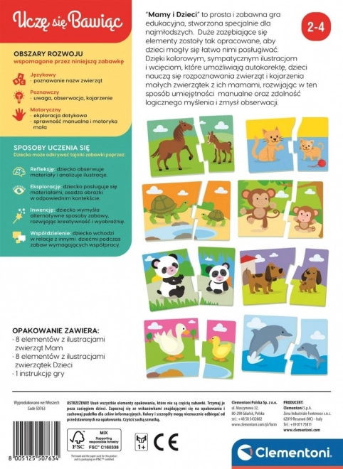 Mamy a deti je jednoduchá a zábavná vzdelávacia hra určená špeciálne pre najmenšie deti. Veľké zapadajúce dieliky, ktoré sú bezpečné a pevné, boli navrhnuté tak, aby sa s nimi deťom ľahko manipulovalo. Vďaka farebným, priateľským ilustráciám a výstupkom, ktoré umožňujú vlastnú kontrolu, sa deti učia rozpoznávať zvieratá a spájať mláďatá s ich mamami, čím si rozvíjajú manuálne zručnosti, logické myslenie a zmysel pre pozorovanie.