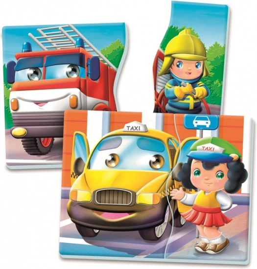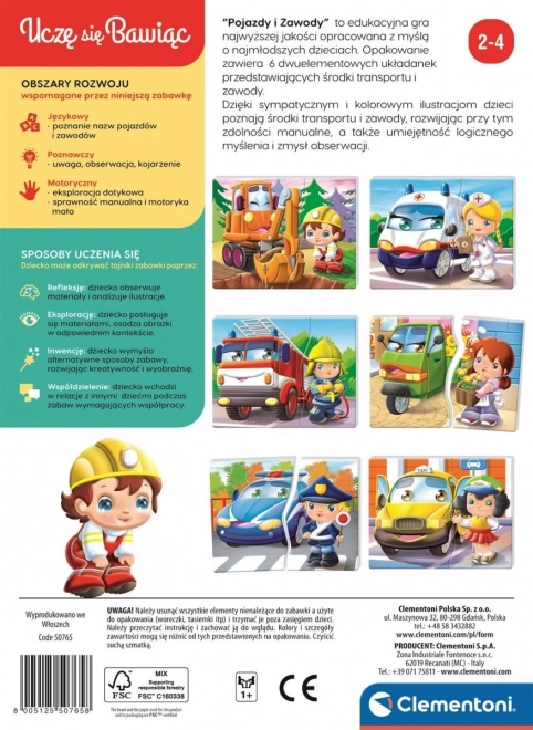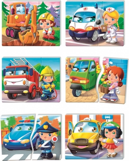 Motorové vozidlá a povolania je vzdelávacia hra najvyššej kvality vyvinutá s ohľadom na najmenšie deti. Balenie obsahuje 6 dvojdielnych puzzle znázorňujúcich dopravné prostriedky a povolania. Vďaka pekným a farebným ilustráciám sa deti učia o dopravných prostriedkoch a profesiách, rozvíjajú manuálnu zručnosť a tiež logické myslenie a zmysel pre postreh.