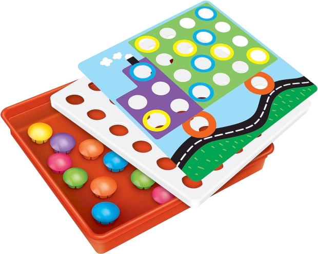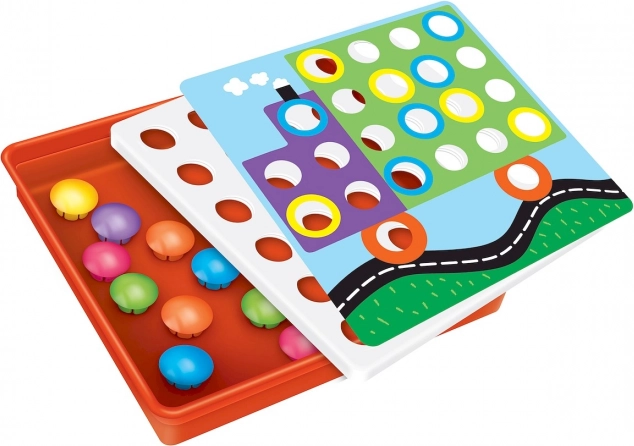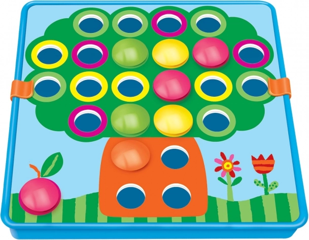Začnite hrať tak, že stiahnete priehľadnú fóliu a vyberiete farebné kruhové obrazce. Vyberte si kartu, položte ju na prekryvnú fóliu a začnite hrať umiestňovaním okrúhlych dielikov na správne miesta.