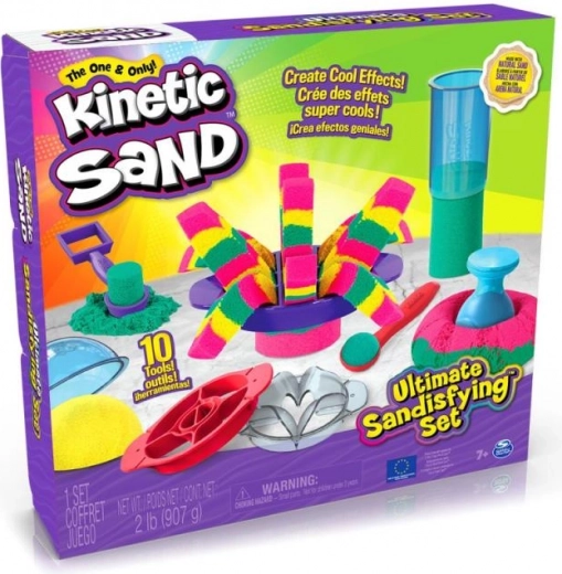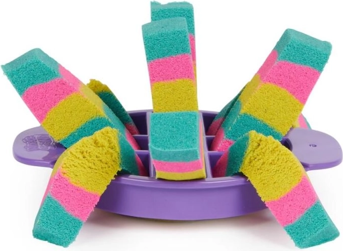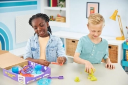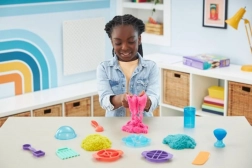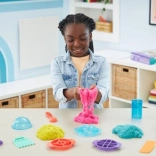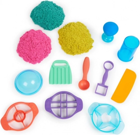 Ultimátna sada pre milovníkov kinetického piesku prináša 900 g piesku v troch farbách (ružová, žltá, modrozelená) a 10 šikovných nástrojov vrátane 3 exkluzívnych rezacích pomôcok pre ohurujúce efekty. Deti môžu piesok miešať, vrstviť, krájať, lisovať a tvarovať podľa fantázie – hra je návyková, upokojujúca a bezpečná.