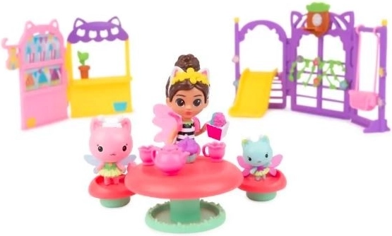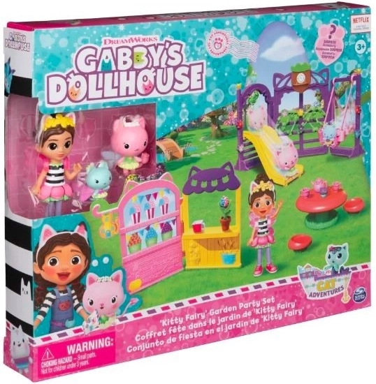Sada na záhradnú párty: Uži si skvelé doplnky na záhradnú párty v štýle Mačacieho domčeka, ako sú hojdačka a šmýkačka, stojan s občerstvením a popcornom, čajový servis s koláčikmi, hubový stolík so stoličkami a ďalšie!