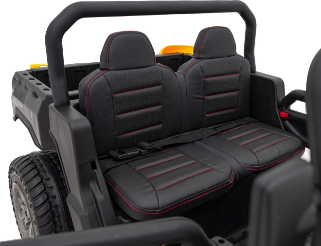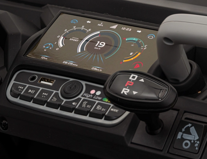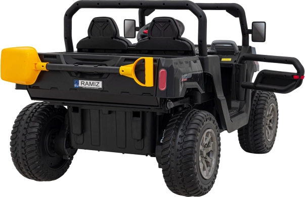 Praktický zadný cargo priestor s elektricky zdvíhaným vyklápačom a otváracou zadnou časťou nabáda k prevážaniu hračiek aj piesku – súčasťou je aj žltá lopatka. Dvojmiestne sedadlo z eko kože s bezpečnostnými pásmi poskytuje komfort, zatiaľ čo palubný panel s MP3/SD/AUX, zvukmi vo volante a ukazovateľom nabitia sa postará o zábavu a prehľad o batérii.
