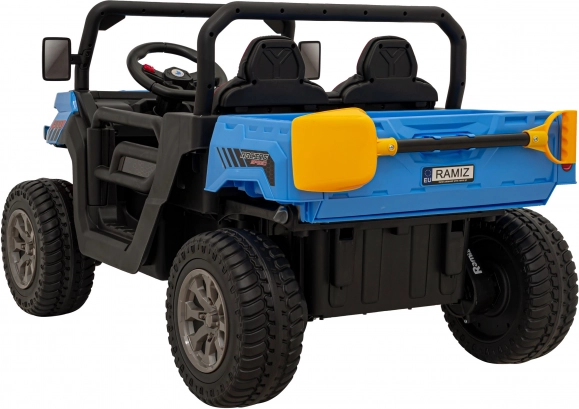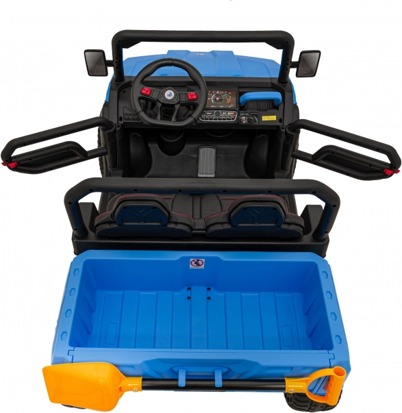 Rodičia majú všetko pod kontrolou vďaka diaľkovému ovládaniu 2.4 GHz s tromi rýchlosťami a bezpečnostným tlačidlom Stop. Deti poteší realistický kokpit s voličom jazdných režimov, pomalý rozjazd pre plynulé štarty, svietiace LED svetlomety a audio panel s MP3/SD/AUX aj zvuky vo volante. Súčasťou je aj praktická lopatka pre hravé expedície.