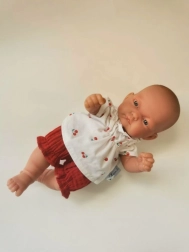 Mušelínová sada pre bábiky je starostlivo ušitá v Poľsku, čo zaručuje vysokú kvalitu a bezpečnosť. Materiál je možné žehliť na nízku teplotu alebo ešte lepšie, použiť paru pre zachovanie štruktúry. Táto sada je ideálna pre deti od 3 rokov a spĺňa všetky bezpečnostné štandardy CE. Motív čerešní pridáva sade jedinečný vzhľad, ktorý si zamiluje každé dieťa.