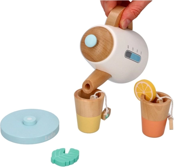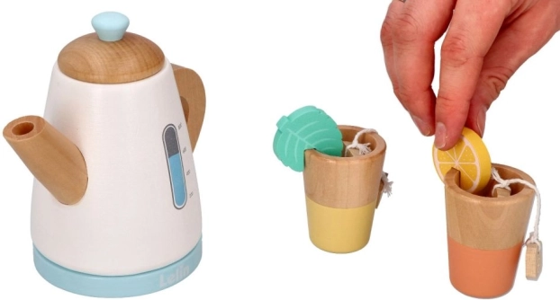 Zapojte sa do hry na čajovú párty s drevenou čajovou súpravou, ktorá zahŕňa kanvicu, hrnčeky a príslušenstvo ako plátky citróna a čajové sáčky.
