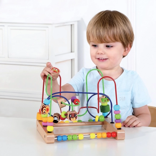 Drevený labyrint so zvieratkami je ideálnou hračkou pre malých objaviteľov od 18 mesiacov. Vďaka pestrým korálikom a roztomilým zvieracím kamarátom deti zábavnou formou trénujú koordináciu oko–ruka a učia sa rozpoznávať farby aj tvary. Hra s korálikmi zároveň podporuje prvé krôčiky k počítaniu a prirodzene rozvíja logické myslenie.